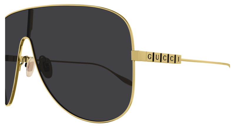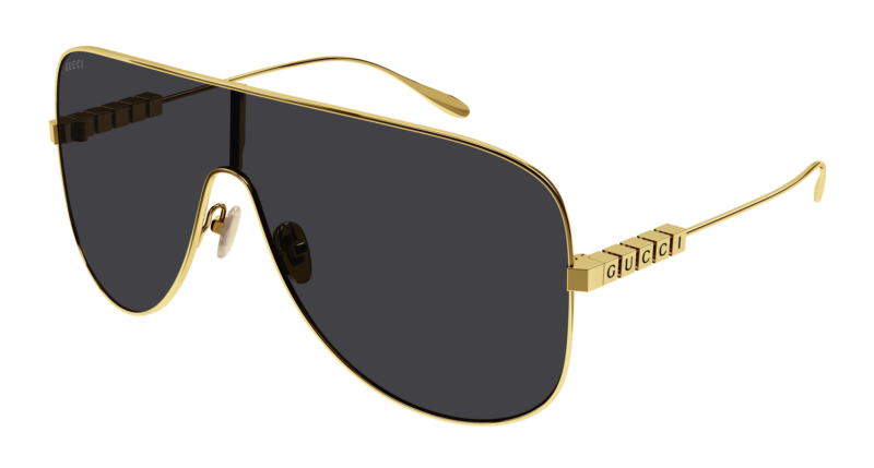 Con i suoi cubi in metallo, semplici ma iconici, il concetto Lettering mette in risalto il logo Gucci all’interno di una costruzione inedita e inconfondibile. Maschera con montatura intera in metallo. La scritta Gucci si presenta smaltata sui caratteristici cubi in metallo. La palette cromatica propone una struttura in metallo dorato abbinata a lenti commerciali e alla moda, oltre che una referenza con lenti GUCCISSIMA.