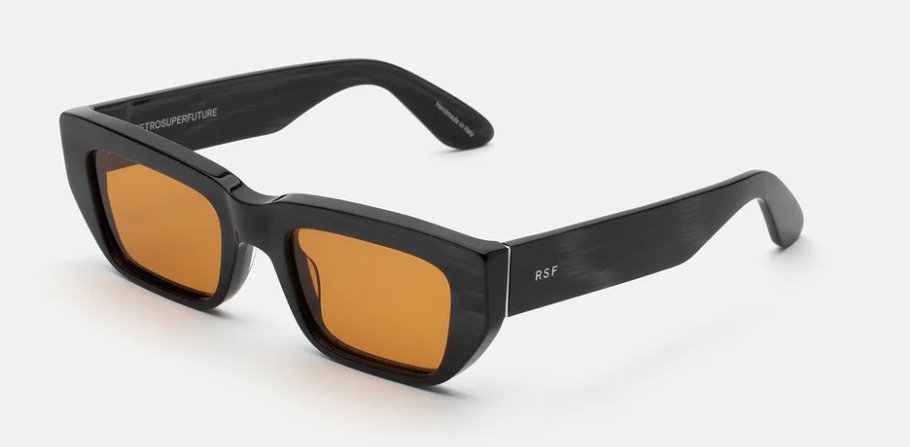 Acetato italiano di alta qualità in un unico acetato nero striato. Monta lenti marroni raffinate Zeiss in base 2. Occhiali di fascia premium fatti a mano in Italia.